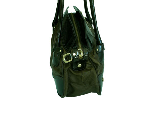Bolsa em Couro Anilina Café com detalhes no seu fechamento e alças em Verniz.