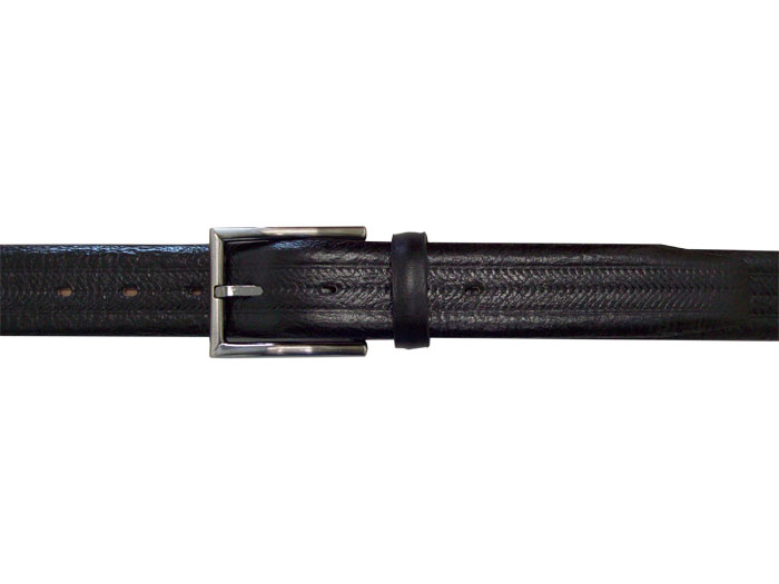 É um cinto social de textura macia, fivela retangular (5,5x4,5cm) cromada no tom acinzentado.