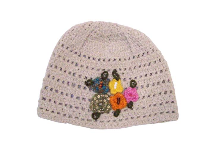 Gorro de Lã Boucle Bordado,medindo 17 centímetros de profundidade e 44 de largura na boca, ele é um gorro feito em croche, tem um bordado com várias aplicações de flor com lantejoulas no meio.