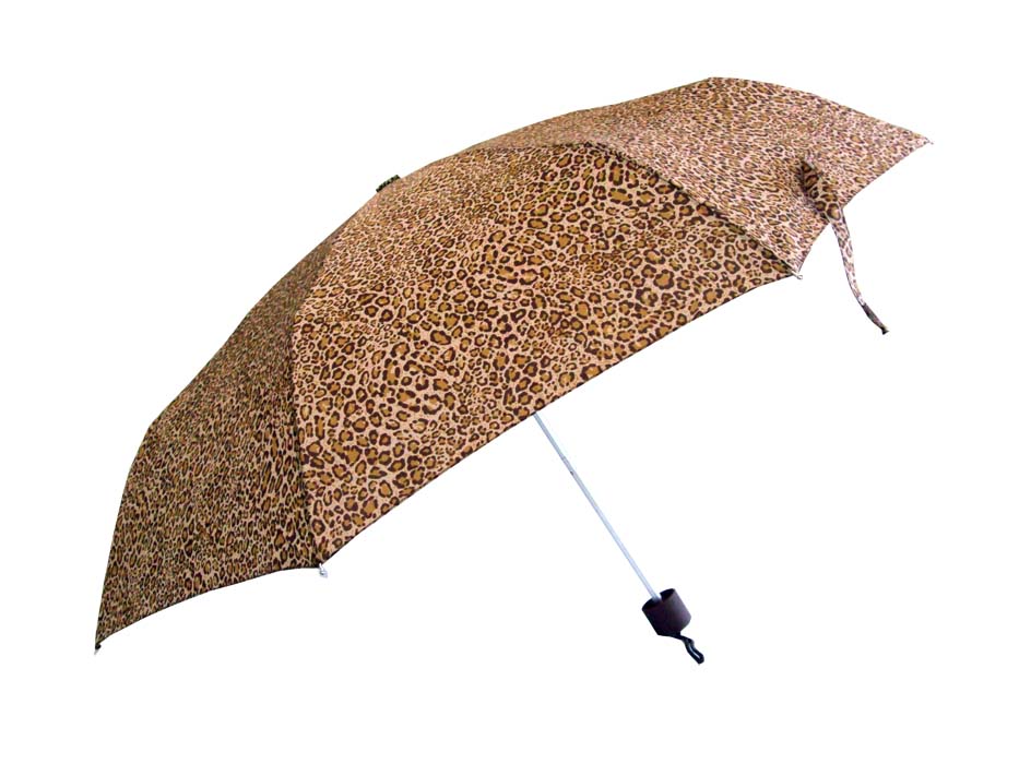 Guarda-chuva Safari Mini em alumínio, 3 secções, abertura manual, 8 varetas x 54 cm, cabo emborrachado, tecido 100% poliéster, com várias estampa de pele de animal.