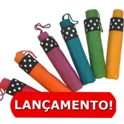 Guarda-chuva Poá mini em alumínio, 3 secções, abertura manual, ,8 varetas x 54 cm, cabo emborrachado, tecido liso com barra preta com poá branco, 100% poliester.